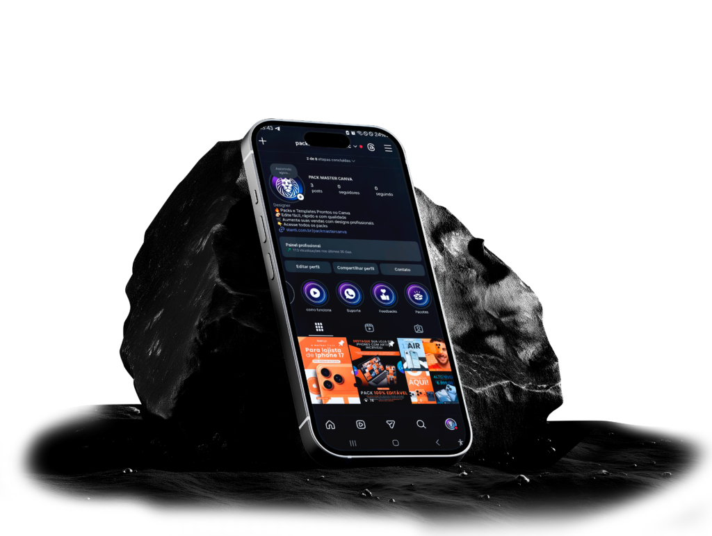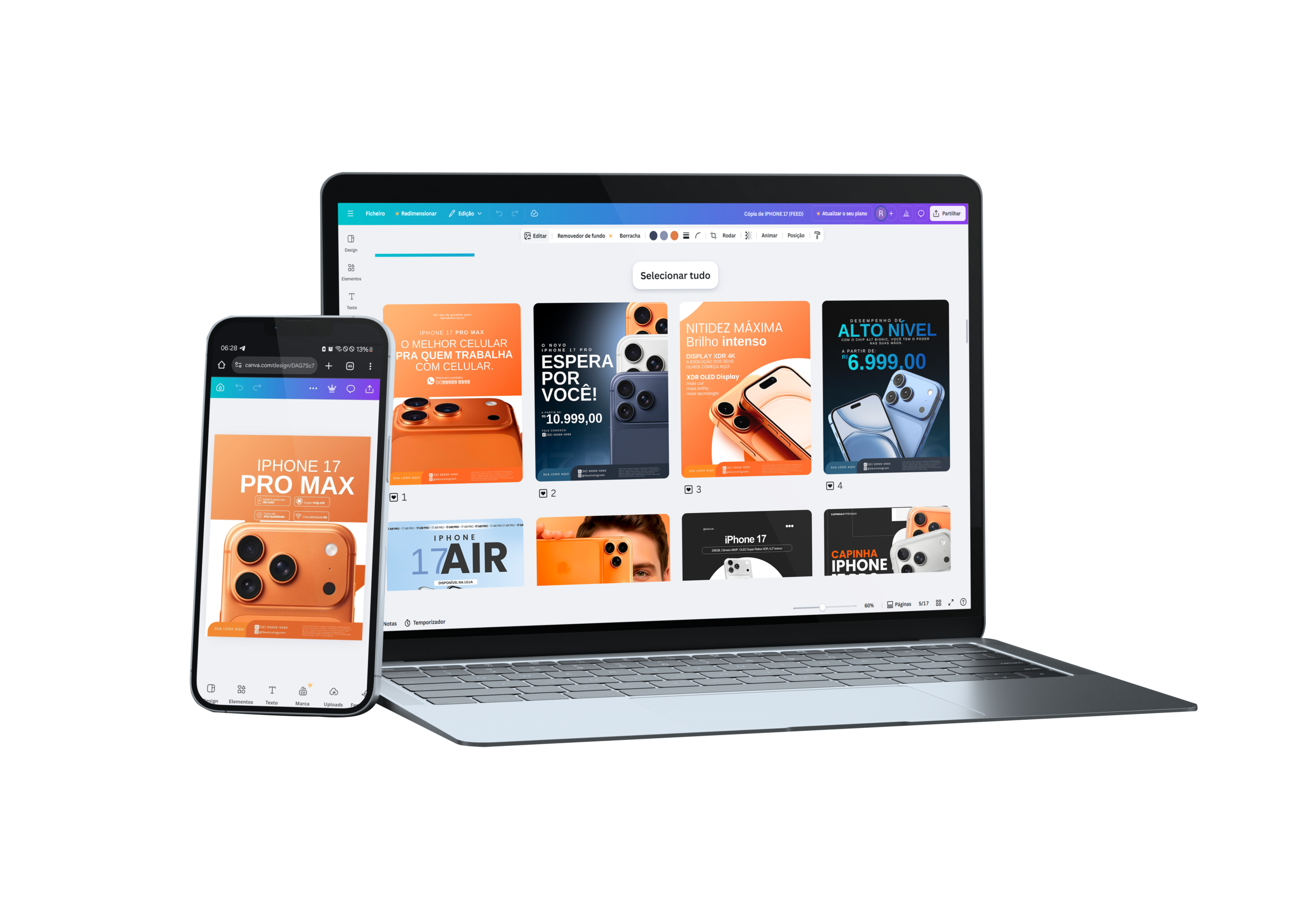 Templates inéditos no Canva, criados para lojistas de iPhone que querem se destacar da concorrência sem perder tempo com design.